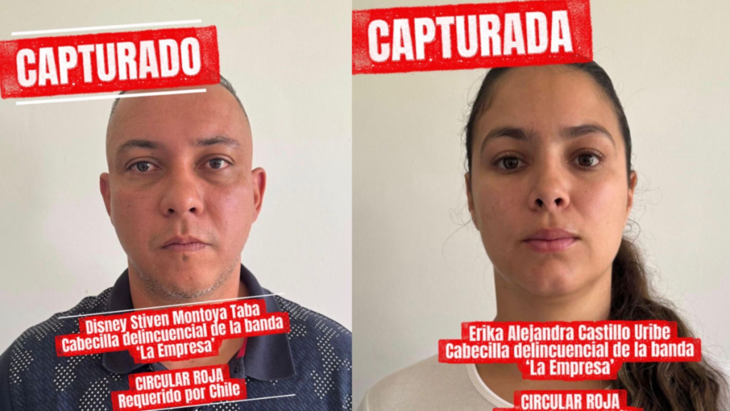 En zona rural del municipio de El Dovio, en el norte del Valle del Cauca, fueron retenidos los ciudadanos colombianos Disney Stiven Montoya Taba y Erika Alejandra Castillo Uribe, requeridos por la justicia de Chile por los delitos de asociación delictiva y lavado de dinero. Ambos eran buscados como presuntos responsables de dirigir una red criminal con operaciones fuera del país.Las autoridades chilenas los señalan como los principales cabecillas de una organización transnacional dedicada al préstamo ilegal conocido como ‘gota a gota’, que delinquía en varias ciudades de Chile bajo el nombre de ‘La Empresa’. De acuerdo con las investigaciones, la estructura imponía cobros con intereses por encima de los topes legales y ejercía amenazas, hostigamientos y presiones constantes contra quienes adquirían los préstamos.La ubicación y retención de Montoya Taba y Castillo Uribe se logró mediante un trabajo coordinado entre la Policía Nacional, a través de la Dijín, la Oficina Central Nacional de Interpol y el grupo AICOR-GREDO, tras el intercambio de información y labores conjuntas de seguimiento internacional.Los seguimientos a la mujer en Chile. Foto:Los seguimientos a la mujer en Chile.Un golpe en 2024En noviembre de 2024, en Chile, detectives de la Brigada Antinarcóticos y Contra el Crimen Organizado (Brianco) y de la Brigada Investigadora de Lavado de Activos (Brilac) de la Policía de Investigaciones desarticularon propinaron un golpe a la red, tras una investigación desarrollada con el Ministerio Público. El operativo incluyó órdenes de entrada y registro a 21 inmuebles ubicados en las regiones de Valparaíso, Metropolitana y O’Higgins.Como resultado de estas diligencias fueron detenidas en su momento 44 personas, 43 de ellas de nacionalidad colombiana. Durante los procedimientos se incautaron 27 motocicletas, cinco automóviles, dinero en efectivo y documentación utilizada para el control de los préstamos y los cobros.Según los equipos especializados de la PDI, la organización operaba con una estructura jerárquica definida y utilizaba inmuebles arrendados exclusivamente para el desarrollo de su actividad. La coordinación se realizaba desde una oficina comercial matriz ubicada en la comuna de Santiago Centro, desde donde se distribuían los recursos y se organizaban las rutas de cobro.La invetsigación se dio desde 2020. Foto:CortesíaLas indagaciones permitieron establecer movimientos bancarios de los integrantes de la red por más de 6.500 millones de pesos chilenos desde el año 2020. Con estos antecedentes, los detenidos fueron puestos a disposición del Juzgado de Garantía de Valparaíso para las audiencias de formalización.De acuerdo con la investigación judicial, entre 2020 y noviembre de 2024 la organización mantuvo operaciones permanentes en ciudades como Valparaíso, Viña del Mar, Quilpué, San Antonio, Los Andes, Santiago y Rancagua. Los préstamos estaban dirigidos principalmente a comerciantes minoristas, a quienes se les exigían pagos periódicos con intereses que superaban los límites permitidos por la ley.Las autoridades establecieron que la jefatura y dirección superior de ‘La Empresa’ recaía en Montoya Taba y Castillo Uribe, quienes residían en Cali, Colombia, desde donde coordinaban las operaciones, supervisaban los flujos de dinero y definían las decisiones estratégicas de la red criminal.Redacción JusticiaJusticia@eltiempo.comMás noticias de Justicia: