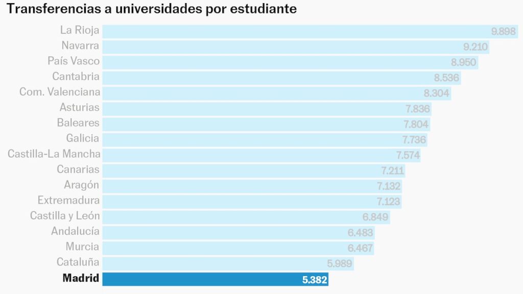 Los cuatro gráficos de este reportaje dejan claro que Madrid está a la cola de financiación por universitario en España, pese a que su consejero de Educación, Emilio Viciana, asegure que los presupuestos están entre “los más altos de la Unión Europea”. El presupuesto de Madrid para universidades no llega a representar el 0,5% del producto interior bruto regional. Lejos del objetivo nacional del Gobierno central de llegar al 1% en 2030, que nos acercaría a Europa (1,2%). Los datos del estudio Las universidades públicas Españolas. Una perspectiva autonómica 2025, de la Fundación Conocimiento y Desarrollo, corresponden al curso 2022/2023, pero Madrid no ha abandonado la cola. Desde entonces, no ha habido una apuesta seria por sacar a las universidades públicas de la ruina y es el motivo por el que este miércoles y jueves la comunidad universitaria de las seis universidades públicas de Madrid está llamada a la huelga. Además, se invita a la sociedad madrileña a acudir a una manifestación el jueves por el centro de la capital.“No habrá paz para quienes nos asfixian: clase a clase, departamento a departamento, facultad a facultad, vamos a construir una huelga que haga temblar a quienes maltratan el derecho a la Universidad Pública”, avisan en su manifiesto las seis plataformas convocantes que aúnan a estudiantes, profesores y los principales sindicatos. Su intención es presionar para que la subida de 2026 ―73,3 millones, un 6,5% más, por debajo del aumento del Presupuesto de la Comunidad― no sea un parche, sino una senda hacia su saneamiento. En 2024, la presión de los rectores, de los consejos de gobierno de los campus y de la oposición en la Asamblea forzaron al Gobierno madrileño a subir 47,3 millones la partida, incluyendo enmiendas de última hora. El 19 de diciembre se votan los Presupuestos y hay tiempo de sobra para que el Gobierno de Isabel Díaz Ayuso haga cambios.Cataluña, cuyas universidades lideran los rankings, tampoco invierte lo necesario, pero el presidente Salvador Illa se ha comprometido a llegar un gasto del 1% en 2030. Sus rectores lamentaron en este diario hace 11 meses la situación de sus homólogos madrileños: “Es una falta de escrúpulos y de respeto por lo público”.Las universidades madrileñas necesitarían 310 millones extra para llegar a las cifras de 2009 descontada la inflación de esos 15 años. En 2012 las transferencias se desplomaron con la crisis y siguieron bajando hasta 2014. Desde entonces, suben cada año, pero la cuenta sigue siendo negativa al descontar la inflación. La Politécnica de Madrid está por encima de la media nacional de transferencias porque sus carreras son muy experimentales y requieren muchos medios. Pero aun así recibe de su gobierno autonómico 3.300 euros menos que la Politécnica de Valencia por alumno.Madrid era en 2023 la sexta región por la cola que peor financiaba los sueldos de sus empleados. En Cataluña, que ha prolongado durante años los contratos parciales con los que cubrieron las bajas durante la recesión, la precariedad ha hecho aún más estragos. La carestía de la vida en Madrid comienza ahora a pasar factura: incapaces de estirar una nómina de apenas 1.400 euros, los profesores ayudantes doctor se mudan —si logran plaza— a ciudades más baratas. Siete decanos de la Complutense relataron este éxodo en EL PAÍS este pasado domingo.Madrid es la comunidad en la que más pagan los alumnos por su matrícula, 454 euros más que la media nacional. Y eso sin contar que en algunas comunidades los universitarios que aprueban no pagan tasas del curso siguiente, aunque no tengan beca del Estado. La medida la aplican Andalucía y Extremadura desde hace años, y empieza ahora a ponerse en marcha en Castilla-La Mancha y Asturias. En época del ministro Manuel Castells, 2020, se acordó con las comunidades autónomas bajar los precios públicos a niveles de 2012, antes del tasazo de José Ignacio Wert. Ayuso, disconforme, acudió a los tribunales para no menguar las tasas, pero terminó vendiendo la medida como un objetivo de su siguiente mandato.Los convocantes también quieren parar la tramitación de la ley madrileña de educación superior. “La Lesuc llega como una imposición, disciplinante y oscura”, valora la plataforma en su manifiesto. Los sucesivos proyectos de la norma cuentan con la enmienda a la totalidad de los rectores, que consideran que con su articulado se invade su autonomía y no blinda el ascensor social que supone la universidad pública. Las altísimas multas a los universitarios por faltas de disciplina incendian también al colectivo. Por ejemplo, 15.000 euros por poner una pancarta sin autorización o 100.000 por participar en escraches. Este miércoles se verá la fuerza o no de los convocantes.