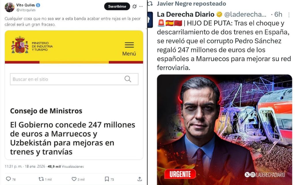 La maquinaria de la desinformación se puso en marcha pocas horas después de conocerse el fatídico choque de dos trenes de alta velocidad a la altura de Adamuz, Córdoba, que por el momento se ha cobrado 39 vidas. Entre los primeros en hacer de altavoz a bulos que responsabilizan directamente a Pedro Sánchez de la catástrofe se cuentan los agitadores ultraderechistas Javier Negre, afincado en EE UU, y Vito Quiles, este desde España. Ambos difundieron en redes una publicación en la que se afirma que “el corrupto Pedro Sánchez regaló 247 millones de euros de los españoles a Marruecos para mejorar su red ferroviaria”. Lo que no se dice es que esa cantidad, que en realidad fueron 750 millones, eran préstamos que el país vecino deberá devolver con intereses y que tendrá que gastar en contratación con empresas españolas. Pero eso da igual. Lo importante es colocar el mensaje, por averiado que esté, en un momento de conmoción nacional en el que la gente busca respuestas y lo visceral puede anteponerse a lo racional.El eurodiputado Alvise Pérez, otro habitual de las redes de desinformación, se sumó a ese carro unas horas más tarde diciendo por su canal de Telegram, que cuenta con casi 650.000 suscriptores, que “Sánchez aprobó créditos por 1.400 millones para proyectos ferroviarios en Marruecos, Egipto y Uzbekistán mientras se denunciaban deficiencias graves de inversión en trenes en España”.Capturas de pantalla del chat de Telegram de Alvise Pérez.El experto en redes y ciberseguridad Marcelino Madrigal ha analizado esta mañana unos 400 mensajes enviados por Telegram que mencionan al ministro de Transportes, Óscar Puente, contra quien se está volcando gran parte del odio vertido en redes. Madrigal corrobora que los canales de Alvise son los que más mensajes difunden sobre Puente, así como que la narrativa de los mismos tiene que ver con la supuesta dejación de funciones al no llevar a cabo un mantenimiento adecuado de las infraestructuras.Un discurso que coincide el del líder de Vox, Santiago Abascal, que ha querido vincular al Gobierno con el descarrilamiento. “El colapso de un Gobierno mafioso está amenazando con colapsar a todo el Estado tanto a nivel nacional como internacional. Punto”, ha indicado Abascal en un mensaje publicado en su cuenta de la red social X. “Nos gobierna el crimen, la mentira y la traición a los intereses del pueblo”, ha añadido.Madrigal también detecta la posible coordinación de algunas cuentas, ya que muchos de los mensajes escrutados se mandaron exactamente a la misma hora, con diferencia de segundos. Es un fenómeno que, en su experiencia, sucede “continuamente”. Insistiendo en la negligencia criminal, la cuenta de Sr Liberal, otro influencer ultra con más de 160.000 seguidores en X, aseguró varias veces que en el Gobierno “lo sabían todo”: “Ni un minuto más a los mandos del Ministerio. Lo sabía, sabían lo que le pasaba a la vía”.Los ataques van principalmente dirigidos contra el Gobierno, pero no solo. Han circulado por redes imágenes de una periodista de TVE, Lourdes Maldonado, sonriendo mientras hablaba de la tragedia. Se trata de una imagen descontextualizada, pues la captura se hizo justo en el momento en el que la presentadora contaba un caso de solidaridad del pueblo de Adamuz. Pese a ello, decenas de cuentas se han ensañado con ella y con la corporación pública por no mostrar respeto hacia las víctimas. Lo mismo ha sucedido con otra imagen en la que se ve a un Óscar Puente sonriente y que también circula por redes junto con mensajes incendiarios.Algunos medios han publicado imágenes falsas del choque de trenes, generadas por inteligencia artificial (IA). Un patrón conocidoLas catástrofes son un avispero muy del agrado de agitadores y desinformadores profesionales. Se vio en octubre de 2024, cuando la dana que mató a 229 personas en Valencia se aprovechó para difundir todo tipo de bulos, desde los que amplificaban el número de víctimas mortales hasta los que llamaban a la organización ciudadana para suplir la supuesta inoperancia de las instituciones.Lo mismo, aunque esta vez sin tragedia mortal de por medio, pero sí con un tufo abiertamente racista, sucedió el año pasado en Torre Pacheco, Murcia, cuando la paliza que sufrió un hombre se usó para organizar “cacerías de inmigrantes” por la zona. El joven detenido por la agresión era de origen marroquí. El vídeo que se viralizó con supuestas imágenes de la agresión correspondía a un episodio distinto -de una paliza previa a un vecino de Almería-, pero nada de ello evitó que se desatara una oleada de ataques racistas contra la comunidad marroquí de Torre Pacheco que mantuvo en vilo a la población durante días.Fe de erroresEn una primera versión de esta información se señalaba, por error, que los agresores del anciano de Torre Pacheco tenían nacionalidad española.