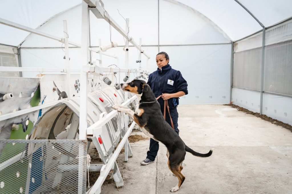 Indiana es una perra de talla grande. Es criolla, pero parecería que tiene rasgos de pitbull. María Lourdes de Alarcón, su instructora, la guía con su correa. Ambas entrenan en el interior de un vivero que tiene como objetivo simular las condiciones de clima de la localidad de Catazajá, en Chiapas, al sur de México, donde el clima puede alcanzar una temperatura entre 35 y 40 grados. Habitualmente el calor sería fatigante ahí dentro, pero debido al frente frío en el país la práctica se ha hecho más llevadera. Es un espacio controlado donde la unidad canina se prepara para evitar que entren plagas y enfermedades a México. Aún le quedan dos meses de instrucción, pero una vez esté preparada, junto a otros cinco canes, serán la próxima generación de oficiales de inspección (de cuatro patas) a la orden del Servicio Nacional de Sanidad, Inocuidad y Calidad Agroalimentaria (Senasica), que serán un filtro más para intentar detener la propagación de la plaga del Gusano Barrenador del Ganado (GBG).El Centro de Adiestramiento Canino (Ceacan) se encuentra escondido en el municipio de Tecámac, en el Estado de México, casi como un secreto gubernamental. Esta dependencia, que forma parte del Senasica, funciona desde 2012. Han formado a 76 generaciones, o su equivalente a más de 300 perros, para la detección en aeropuertos, terminales de camiones o puntos fronterizos de productos fitosanitarios. Ante la emergencia del GBG en el norte de México y en Centroamérica, esta institución ha centrado sus esfuerzos más recientes en la formación especializada de binomios caninos para colaborar con la detección de esta plaga. El GBG es una infestación provocada por las larvas de la mosca Cochliomyia hominivorax, que son las responsables de causar la enfermedad de miasis, en la que larvas de mosca infestan tejido vivo en humanos o animales, alimentándose de él.Hasta octubre de 2025, México ha notificado más de 9.000 casos de miasis por gusano barrenador, de los cuales 839 se mantienen activos y 8.366 concluidos. La mayoría se ha registrado en el Estado de Chiapas, con 4.416 casos. La plaga está extendida en el sureste del país, principalmente en Tabasco, Yucatán, Campeche, Quintana Roo, en el sur de Veracruz, Oaxaca y parte de Puebla.Mayté Tontle Rentería y José Ángel Jiménez Dabur entrenan al perro Harry en el área de inspección fitosanitaria. Nayeli CruzIndiana forma parte de la segunda generación de canes especialistas en detectar el GBG y lleva cuatro meses en formación. Su graduación será en diciembre del año en curso y se sumará a la primera generación que se encuentra destinada casi un año en Catazajá. En Tecámac, Verónica Montes, adiestradora experta en formación de binomios del Ceacan, explica que el proceso de entrenamiento para la detección de esta plaga conlleva distintas etapas. En un inicio, los perros eran de raza golden retriever, labrador o del tipo pastor belga, pero ante la imposibilidad de conseguir este tipo de especímenes de forma constante, optaron por buscar candidatos en centros de albergue para darles a perros sin hogar una segunda oportunidad. “Aprovechamos lo que la naturaleza nos da. La mayoría de los perros de albergue son de calle y para haber sobrevivido desarrollaron la habilidad olfativa por querer alimentarse. Ellos recorren kilómetros para conseguir una tostada, un pan, lo que encuentren. Eso para nosotros es una ventaja más”, afirma Montes.Sin embargo, no todos logran ser seleccionados. Para ser un oficial de inspección de cuatro patas, los candidatos tienen que pasar por rigurosos controles médicos, tener aptitudes como hiperactividad, el gusto por el juego y hasta ser glotones. Esto porque el entrenamiento hace uso del método positivo (sin castigos), premiando el trabajo del perro a base de premios (comida) o juguetes, como una pelota o un objeto para que muerda. “Aparte tiene que ser un perro equilibrado con la presencia de otras personas, con otros perros e incluso con otro tipo de animales, como el ganado, por ejemplo”, explica Montes.Un perro es revisado en el consultorio de CEACAN.Nayeli CruzLa etapa de preselección, el adiestramiento olfativo para productos fitosanitarios, la especialidad para detectar el GBG y posterior entrenamiento para generar un vínculo con su “manejador canino”, tarda aproximadamente unos nueve meses en total. De vuelta en el invernadero, Indiana comienza a olfatear alrededor de un brete ganadero, que es una estructura de manejo y contención para el ganado. Dentro de ella se encuentra una manga con varios orificios que sostienen pequeños frascos con distintos aromas, que se asemeja al lomo de una vaca. En algunos hay comida. En otros, gasa con la sangre por lesiones de garrapatas o de un raspón del mismo animal en jaula; así como gasas con muestras de sangre de un espécimen contaminado por el gusano barrenador. El color predominante en el pelaje de Indiana es el negro, pero con sus patas blancas, parecería como si llevara unos guantes de látex como un inspector humano. Esta se para de dos patas y se apoya en el brete. Huele a detalle uno de los contenedores y se sienta en ese punto señalando su hallazgo. Alarcón, su instructora, la felicita y premia por un buen trabajo.En el campo, lo que procedería tras el señalamiento del perro, sería marcar a ese animal con giz (tiza o crayón) para ganado para que ese espécimen sea revisado a detalle. El frasco que encontró Indiana tiene la gasa con sangre de un ganado vacuno infectado por el gusano barrenador. A pesar de que esa muestra es antigua, es de un color tipo rojo violáceo, posee un olor fuerte y penetrante a carne podrida. Estas muestras que se obtienen en el campo, se las saca para el entrenamiento y después se las mantiene refrigeradas. Duran, aproximadamente, siete días para el proceso de enseñanza. La concentración del aroma al inicio es intensa, pero con el paso de los días va perdiendo fuerza. 